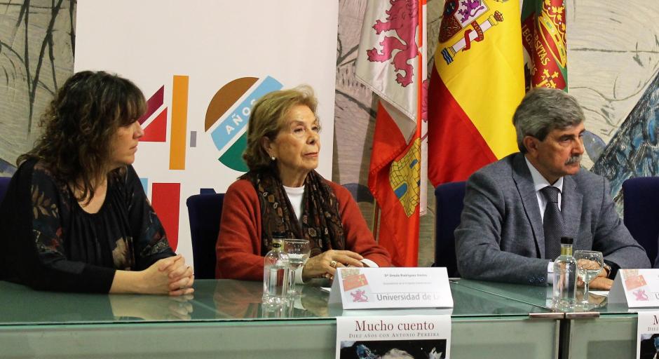 (Imágenes: 1.- La Vicerrectora de Relaciones Institucionales y con la Sociedad de la ULE, Mª Dolores Alonso Cortés, Úrsula Rodríguez Hesles y el Rector Juan Francisco García Marín, en una foto de archivo del acto de presentación del espectáculo 'Mucho Cuento, diez años con Antonio Pereira', en abril de 2019 2.- El escritor Antonio Pereira 3.- Úrsula Rodrígu3ez Hesles, en el acto anteriormente apuntado)