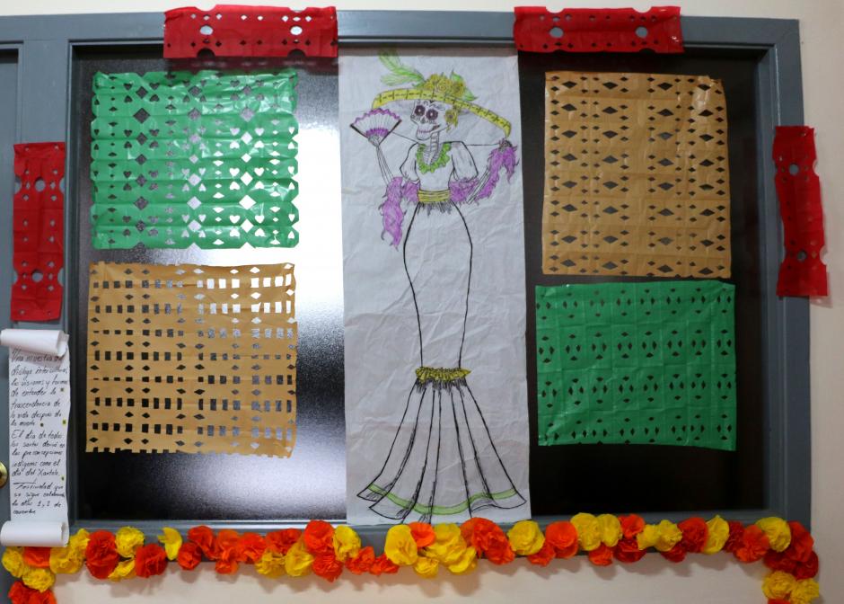Allí recrean la tradición a través de un altar donde la parte de abajo evoca la flor de cempasúchil, originaria de México, un arco que simula la entrada al Mictland, tres cajas decoradas que simbolizan, de abajo a arriba, la tierra, el purgatorio y el cielo, y en la parte alta del altar el dibujo de una calavera disfrazada, obra de otra compañera mexicana que cursa Historia del Arte en la ULE. Con este trabajo han querido ofrecer “una muestra del diálogo intercultural de las visiones y formas de entender la trascendencia de la vida después de la muerte”, explican Alejandra Cuevas y Fernando Barrueta.