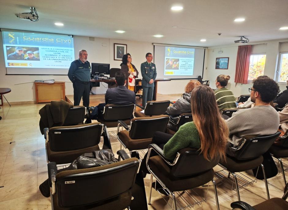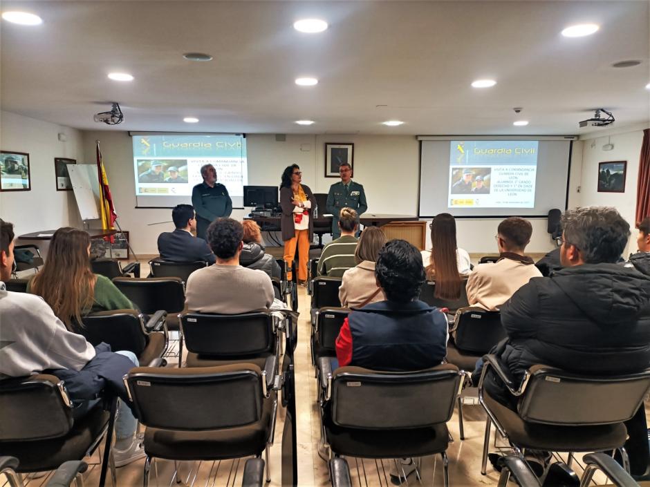 León, 17 de noviembre de 2025.- Estudiantes de tercer curso de grado en Derecho y del quinto curso de doble grado en Derecho y Administración y Dirección de Empresas (DADE) de la Universidad de León han visitado la sede de la Comandancia de la Guardia Civil de León - ubicada en el Acuartelamiento “El Parque” de la capital leonesa.