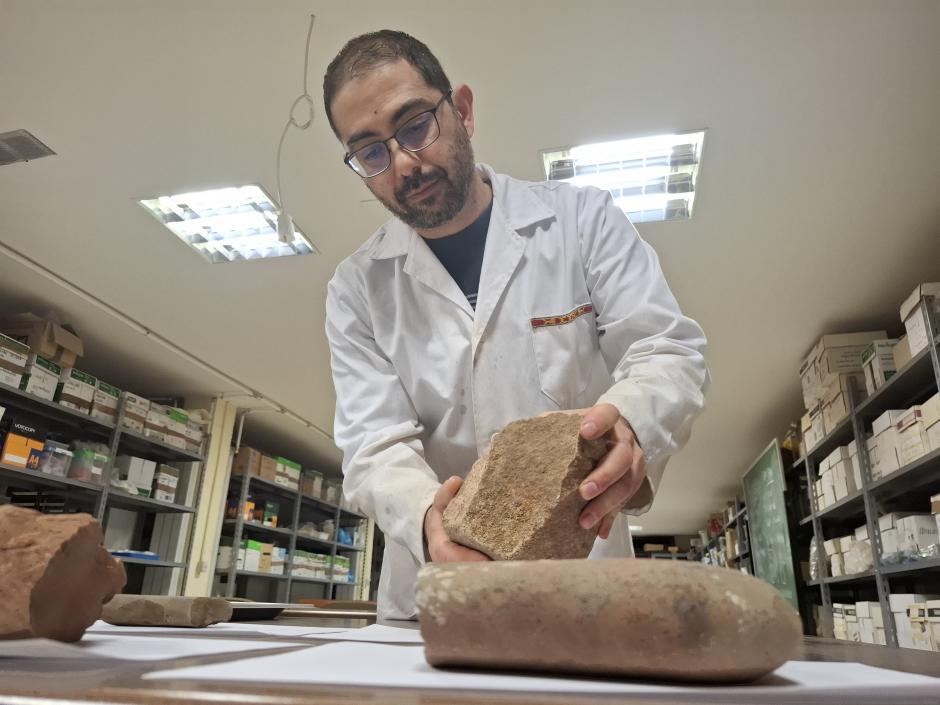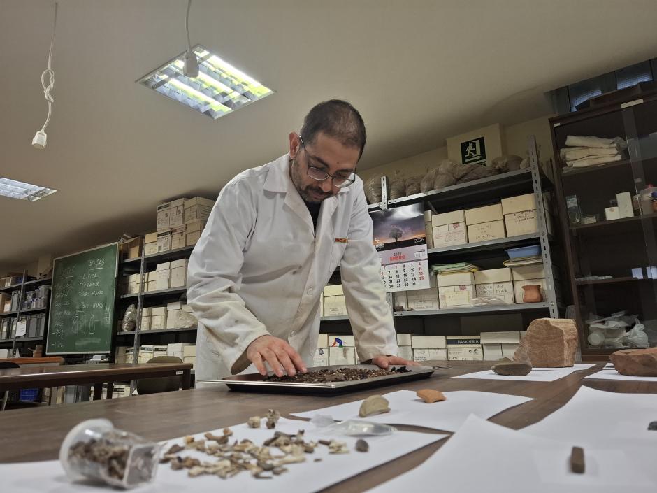 Eduardo González Gómez de Agüero en el laboratorio de Arqueología de la ULE con restos hallados en el yacimiento de La Ercina.