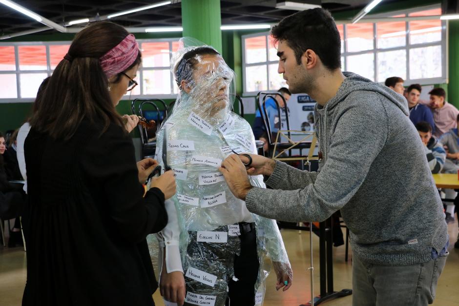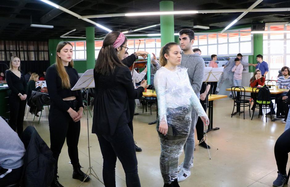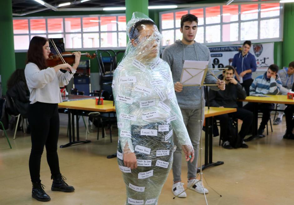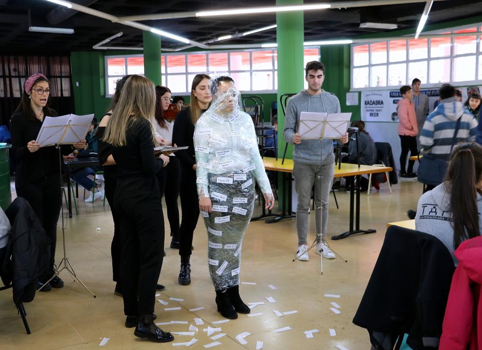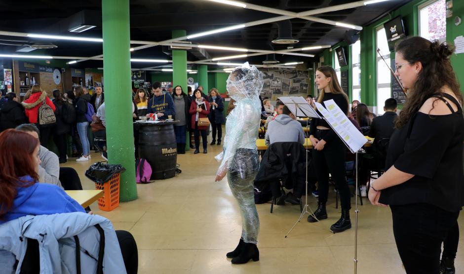 (Fotografías: Primera: Representación teatral de un grupo de estudiantes ayer en la cafetería central del Campus de Vegazana. Segunda y Tercera: Durante la performance se dio lectura a los nombres de las 51 mujeres asesinadas en lo que va de año, víctimas de la violencia machista. Cuarta: La obra se realizó también la jornada previa en el Campus de Ponferrada. Quinta: Exposición 'Mensajes por la Igualdad' en el Edificio de Servicios del Campus de Vegazana. Sexta y Séptima: Los nombres de las víctimas fueron pegados uno a uno en la alumna aprisionada previamente en cinta transparente de la fue liberada por sus compañeros a modo de metáfora de respeto, liberación, libertad e igualdad ).