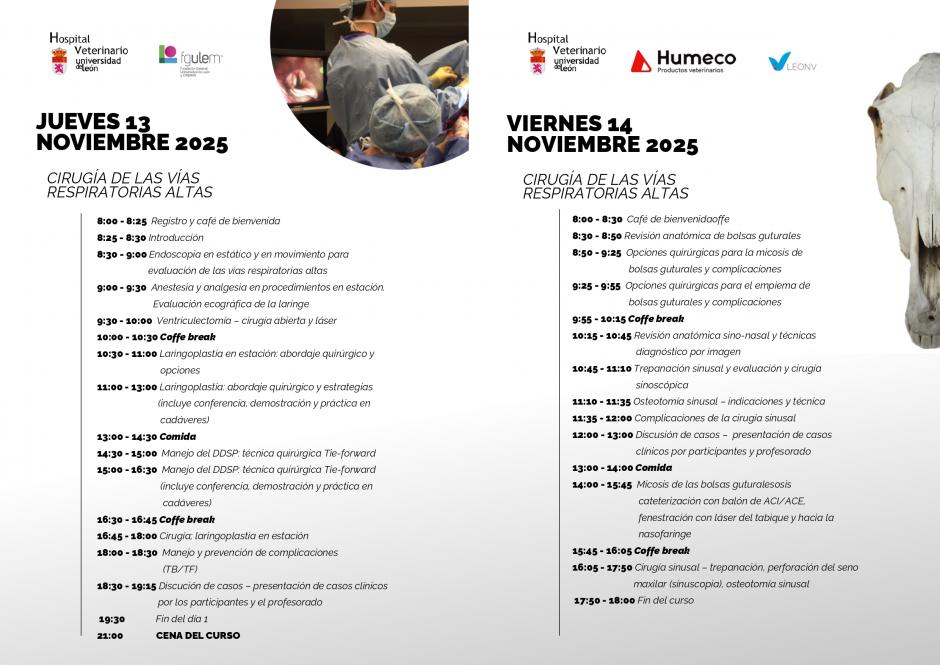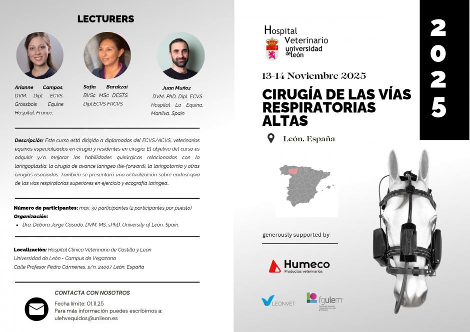 - Dirigido a veterinarios y residentes en cirugía veterinaria, este encuentro permitirá actualizar conocimientos en laringoplastia, cirugía ‘tie-forward’, laringotomía, endoscopia y ecografía laríngea, con un enfoque práctico y de alta especialización