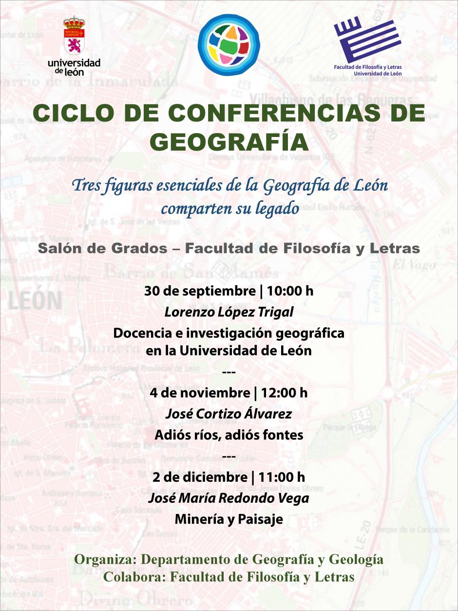- Lorenzo López Trigal, Catedrático de Geografía Humana dará la primera conferencia este martes 30 de septiembre, José Cortizo Álvarez, profesor de Análisis Geográfico Regional, el 4 de noviembre y José María Redondo Vega, Catedrático de Geografía Física y profesor emérito honorario, cerrará el ciclo el 2 de diciembre