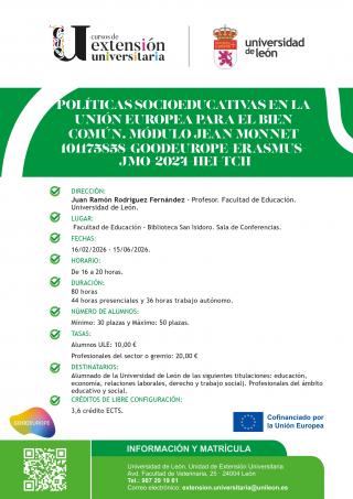 León, 15 de enero de 2026. El Departamento de Didáctica General, Específicas y Teoría de la Educación de la Universidad de León (ULE) ha organizado, con la colaboración del Programa Erasmus, el Módulo Jean Monnet titulado ‘Políticas educativas y sociales para una Europa del bien común’, que se impartirá entre los días 15 de febrero y 15 de junio, bajo la dirección del profesor Juan Ramón Rodríguez Fernández, de 16 a 20 horas.