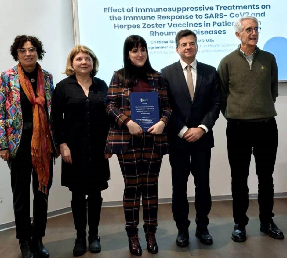 Se trata de una tesis por compendio de publicaciones que integra tres artículos científicos publicados en revistas de alto impacto internacional, titulada ‘Efecto de los tratamientos inmunosupresores sobre la respuesta inmunitaria a las vacunas frente al SARS-CoV-2 y el herpes zóster en pacientes con enfermedades reumáticas’, dentro del programa de Doctorado Investigación Aplicada a las Ciencias Sanitarias por la Universidad de Las Palmas de Gran Canaria y la Universidad de León.
