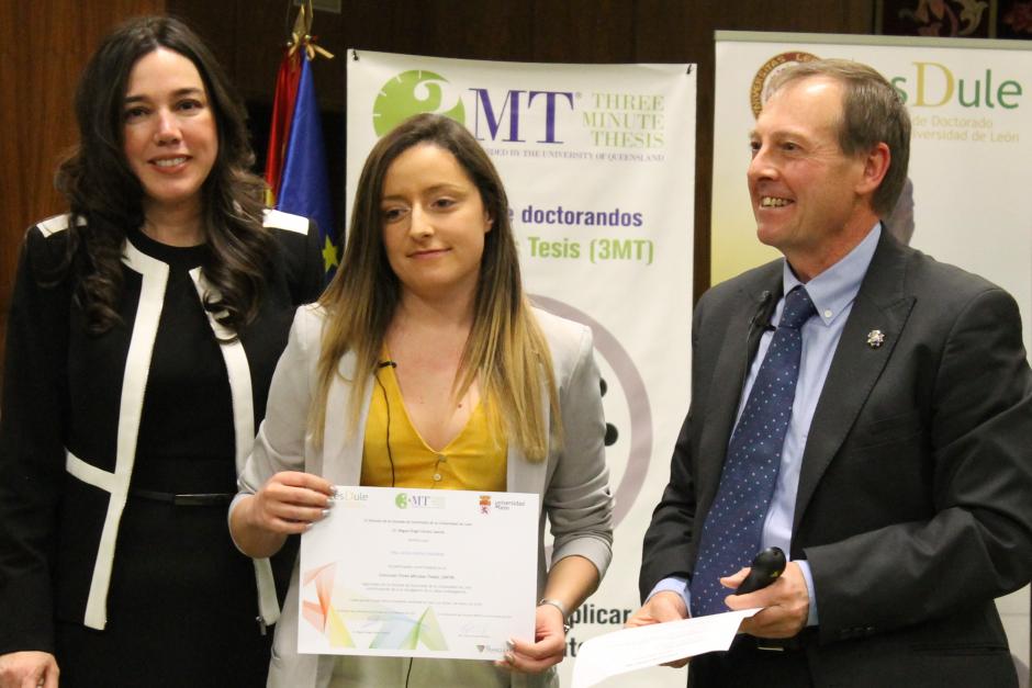 (Imágenes: 1.- Laura Lindo Yugueros en la defensa de su tesis 2.- Los directores y la autora de la tesis posan con el tribunal 3.- Fotografía de archivo de Laura Lindo Yugueros, que en febrero de 2019 obtuvo el segundo premio en el concurso 3MT, en el que explicó su tesis en tres minutos)